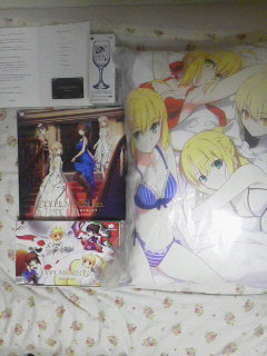 先行販売していた一番くじにも二回チャレンジし、目的だったF賞のグラス(式)とC賞のセイバークッションをゲットし、物販でパンフとクッキーを買ってきました!
